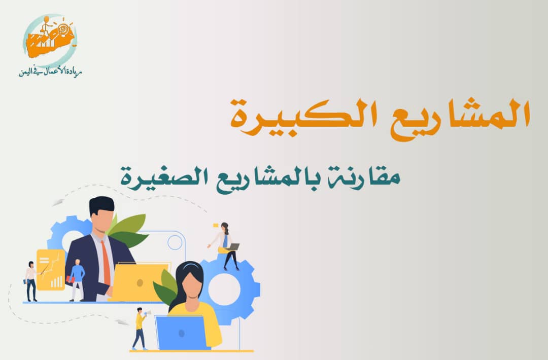 بينما الانتاج في المشاريع الكبيرة يفوق في بعض الاحيان حجم السوق بالتالي الخسارة فيها تكون مدوية بشكل واسع.5- انخفاض تكلفة العمالة، والآلات بسيطة ولا تتسم بالتعقيد.بينما ترتفع تكاليف العمالة في المشروعات الكبيرة لتطلبها لخبرات ربما تكون تكلفتها باهضه جدا.فالتكاليف الثابتة ( رواتب ايجارات، صيانة ، خدمات) مرتفعة في المشاريع الكبيرة، بخلاف المشاريع الصغيرة التي ربما لا توجد فيها بعض هذه التكاليف ناهيك عن انخفاضها. 6- لا تتطلب المشروعات الصغيرة بنية تحتية ذات حجم كبير، فيمكن القيام بها من المنزل وبأبسط التكاليف والجهد.بينما المشروعات الكبيرة تتطلب بنية تحتية متكاملة، من مكائن ومعدات وآلات وسيارات وعقارات وأصول تشغيلية وغيرها.7-السوق التنافسية في المشاريع الصغيرة محدودة، ولا تؤثر على أصحاب المشاريع، لا سيما إذا تعلق المشروع بالاحتياجات الضرورية للعميل كالبقالات مثلا وسوق الجملة.بينما السوق التنافسية للمشاريع الكبيرة عالية جدا، حيث أن نزولا في سعر معين يكلف الشركات مبالغ طائلة جدا. فمثلا تتنافس على الريال الالكتروني اليوم في اليمن شركات كبيرة وهي كوليتي كونكت بالتعاون مع بنك اليمن والكويت وفي الجانب الآخر كاك بنك، وكلا الشركتين تنفقان ميزانية كبيرة على تسويق الريال الالكتروني.