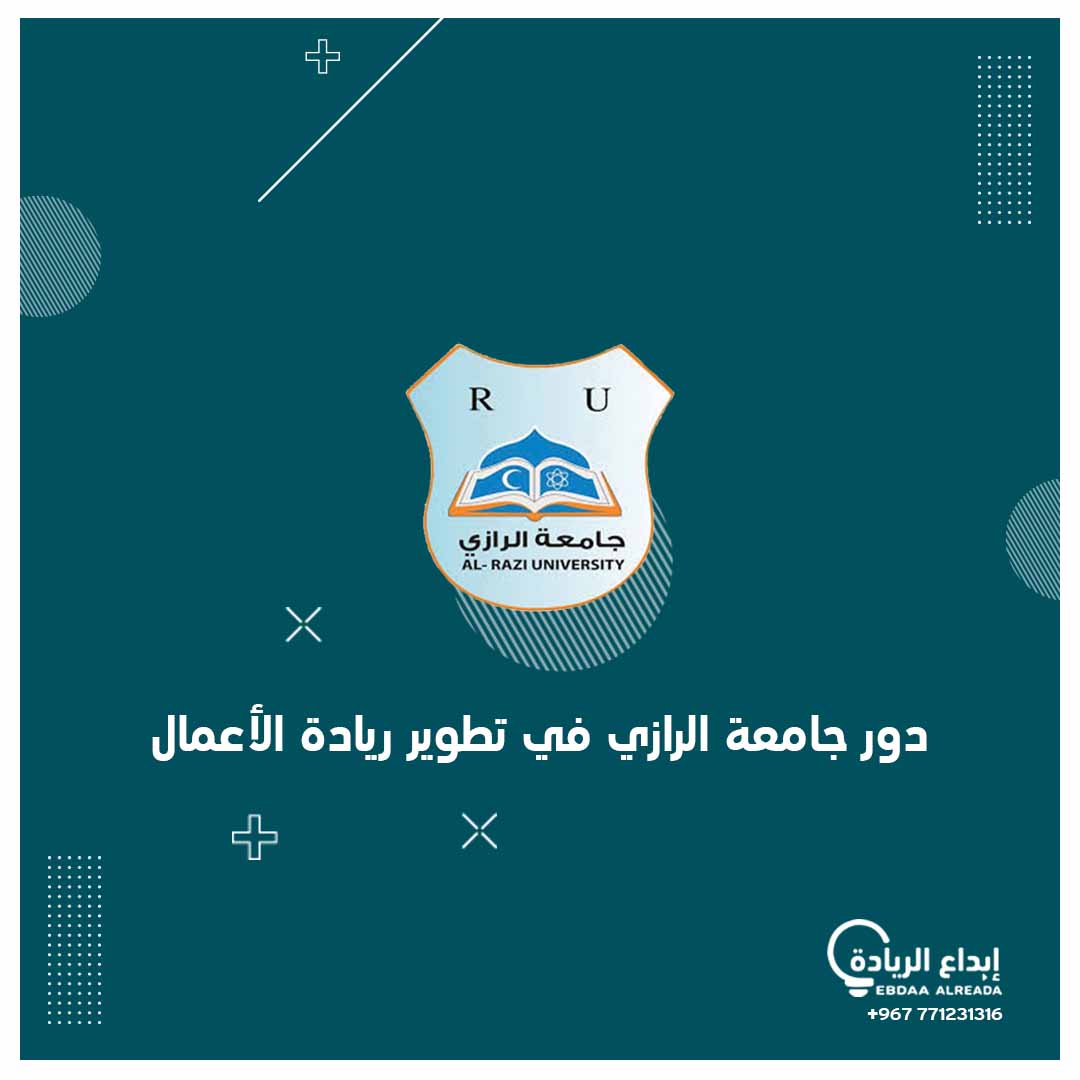 وكانت جامعة الرازي من أول الجامعات اليمنية التي أدخلت في خطط التدريس مقرر ريادة الأعمال من خلال مقرر نظري، وأخر عملي، وأيضاً القيام بالأبحاث والدراسات الخاصة بريادة الأعمال وأصبح مقرر ريادة الأعمال من المقررات الأساسية لطلبة البكالوريوس وطلبة الماجستير في برامج إدارة الأعمال وبرنامج إدارة الأعمال الدولية، فضلاً عن تنفيذ دورات التأهيل وورش العمل الخاصة بريادة الأعمال التي تتم بمركز التدريب بالجامعة، فقد عملت الجامعة على موائمة مخرجات مقرر ريادة الأعمال مع مكونات الجامعة منها الرؤية والرسالة والبرامج الاكاديمية التي تنمي التميز، حيث تهدف مخرجات مقرر ريادة الاعمال إلى اكتساب الطلاب والطالبات مهارات اقتناص الفرص الاستثمارية بطريقة ريادية والعمل بروح الابداع والابتكار في إعداد خطط إنشاء مشروعات ريادية اقتصادية متكاملة لتوفير منتجات أو خدمات تلبي حاجات ورغبات الزبون.