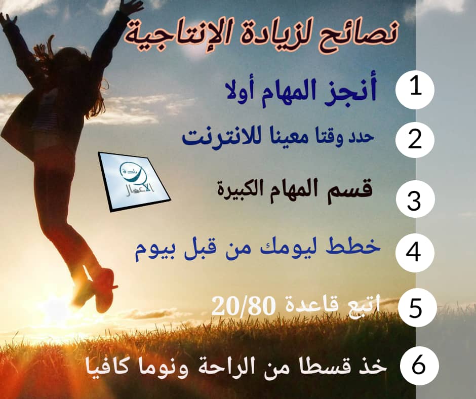 إدارة الانتاج والعمليات تدرس ضمن مقررات المنهجية للدراسة في كليات الادارة، وتوضع حولها المبادئ والقيم وأهم النظريات لتطوير عمليات الانتاج والرفع من كفاءة الانتاج، وهنا نريد أن ننقل أهم النصائح المطبقة بالفعل وهي تساعد الموظف وصاحب العمل والمدير وكل انسان على زيادة انتاجيته، فكما يقال: ليس المهم كم ساعة تعمل لكن المهم ماذا حققت في ساعات عملك، فكانت هذه هي أفضل النصائح لزيادة الانتاجية وتطوير الأداء.أفضل النصائح لزيادة الانتاجية وتطوير الأداء